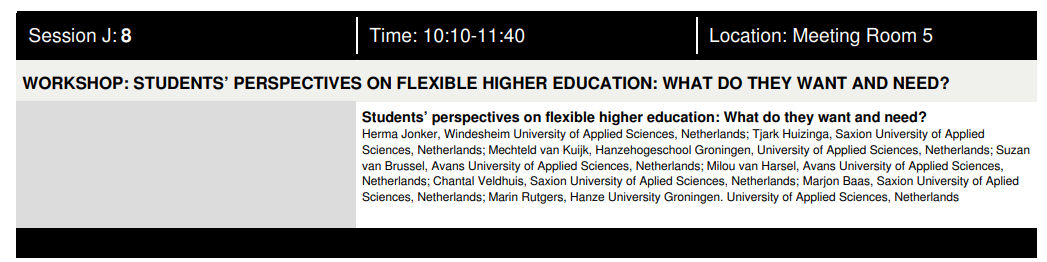 where they learn, and/or with whom. However, HE institutes raise the question of what preferences and needs different stakeholders have with regard to flexibility, so that suitable choices can be made in the design of policies, curricula, and student support programs. In this workshop, we focus on student preferences and share recent insights from research on HE students' preferences regarding flexible education. Moreover, we use participants’ expertise to identify new (research) questions to further explore what students’ needs imply for several domains, namely curriculum-design, student support that is provided by educators/staff, policy, management, and the professional field. Firstly, a conceptual framework on flexible education and student’s preferences will be presented. Secondly, participants reflect in groups on student personas. Then, discussion groups have a Delphi-based discussion to collect new ideas for research. Finally, participants share the outcomes on a ‘willing wall’ and a ‘wailing wall’.