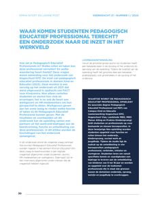 Onderzoek naar de manier waarop Pedagogisch Educatief Professionals kunnen worden ingezet in het domein Kind en Educatie. Na afloop van onderzoek kan geconcludeerd worden dat Pedagogisch Educatief Professionals breed kunnen worden ingezet en dat er geen sprake is van een vastomlijnde functie. Door het werkveld worden wel mogelijkheden gezien voor taken en verantwoordelijkheden voor deze nieuwe professional, maar er wordt nog geworsteld om deze op een eenduidige manier en met passende waardering in te schalen in het functiehuis.