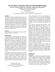 The internet is becoming a tightly interwoven part of our everyday lives. There is a growing market for web services which augment the daily life of users trough products with an internet connection. We call these real world extensions of the web embedded media. In the last couple of years we explored embedded media design through student projects with real world clients. We learned that the UX difficulty of embedded media design is to mix, enforce and augment existing user experiences. We’ve tried to capture this challenge in the intuitive notion of experience blend. In this paper we use examples from our project work to introduce this notion of experience blend.