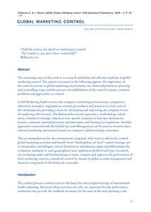 The reasoning issue of this work is to research and define the efficient methods of global marketing control. The report is focused on the following aspects: the importance of the control systems in global marketing environment, the relationship between planning and controlling, types and the process of establishment of the control systems, common problems and approaches to control.
