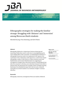 Ethnographic fieldwork is a balancing act between distancing and immersing. Fieldworkers need to come close to meaningfully grasp the sense-making efforts of the researched. In methodological textbooks on ethnography, immersion tends to be emphasized at the expense of its counterpart. In fact, ‘distancing’ is often ignored as a central tenet of good ethnographic conduct. In this article we redirect attention away from familiarization and towards ‘defamiliarization’ by suggesting six estrangement strategies (three theoretical and three methodological) that allow the researcher to develop a more detached viewpoint from which to interpret data. We demonstrate the workings of these strategies by giving illustrations from Machteld de Jong’s field- and text-work, conducted among Moroccan-Dutch students in an institution of higher vocational education.