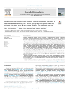 Literature highlights the need for research on changes in lumbar movement patterns, as potential mechanisms underlying the persistence of low-back pain. Variability and local dynamic stability are frequently used to characterize movement patterns. In view of a lack of information on reliability of these measures, we determined their within- and between-session reliability in repeated seated reaching. Thirty-six participants (21 healthy, 15 LBP) executed three trials of repeated seated reaching on two days. An optical motion capture system recorded positions of cluster markers, located on the spinous processes of S1 and T8. Movement patterns were characterized by the spatial variability (meanSD) of the lumbar Euler angles: flexion–extension, lateral bending, axial rotation, temporal variability (CyclSD) and local dynamic stability (LDE). Reliability was evaluated using intraclass correlation coefficients (ICC), coefficients of variation (CV) and Bland-Altman plots. Sufficient reliability was defined as an ICC ≥ 0.5 and a CV < 20%. To determine the effect of number of repetitions on reliability, analyses were performed for the first 10, 20, 30, and 40 repetitions of each time series. MeanSD, CyclSD, and the LDE had moderate within-session reliability; meanSD: ICC = 0.60–0.73 (CV = 14–17%); CyclSD: ICC = 0.68 (CV = 17%); LDE: ICC = 0.62 (CV = 5%). Between-session reliability was somewhat lower; meanSD: ICC = 0.44–0.73 (CV = 17–19%); CyclSD: ICC = 0.45–0.56 (CV = 19–22%); LDE: ICC = 0.25–0.54 (CV = 5–6%). MeanSD, CyclSD and the LDE are sufficiently reliable to assess lumbar movement patterns in single-session experiments, and at best sufficiently reliable in multi-session experiments. Within-session, a plateau in reliability appears to be reached at 40 repetitions for meanSD (flexion–extension), meanSD (axial-rotation) and CyclSD.