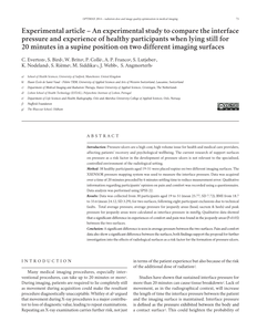 Introduction: Pressure ulcers are a high cost, high volume issue for health and medical care providers, affecting patients’ recovery and psychological wellbeing. The current research of support surfaces on pressure as a risk factor in the development of pressure ulcers is not relevant to the specialised, controlled environment of the radiological setting. Method: 38 healthy participants aged 19-51 were placed supine on two different imaging surfaces. The XSENSOR pressure mapping system was used to measure the interface pressure. Data was acquired over a time of 20 minutes preceded by 6 minutes settling time to reduce measurement error. Qualitative information regarding participants’ opinion on pain and comfort was recorded using a questionnaire. Data analysis was performed using SPSS 22. Results: Data was collected from 30 participants aged 19 to 51 (mean 25.77, SD 7.72), BMI from 18.7 to 33.6 (mean 24.12, SD 3.29), for two surfaces, following eight participant exclusions due to technical faults. Total average pressure, average pressure for jeopardy areas (head, sacrum & heels) and peak pressure for jeopardy areas were calculated as interface pressure in mmHg. Qualitative data showed that a significant difference in experiences of comfort and pain was found in the jeopardy areas (P<0.05) between the two surfaces. Conclusion: A significant difference is seen in average pressure between the two surfaces. Pain and comfort data also show a significant difference between the surfaces, both findings support the proposal for further investigation into the effects of radiological surfaces as a risk factor for the formation of pressure ulcers.