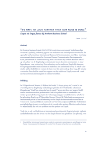 Bij Arnhem Business School (HAN, FEM) wordt door overwegend Nederlandstalige docenten Engelstalig onderwijs gegeven aan studenten met uiteenlopende moedertalen. In opdracht van het instituut International Business & Communication werd deze meertalige communicatiesituatie vanuit het Lectoraat Human Communication Development in kaart gebracht met als onderzoeksvraag: Wat is de situatie bij Arnhem Business School op het gebied van de Engelstalige communicatie tussen docenten en studenten en waar liggen kansen voor verbetering? Een nulmeting van het taalniveau Engels bij docenten, focusgroepgesprekken met docenten en studenten, een aansluitend survey en enkele casestudies uit het bedrijfsleven vormen de basis voor het antwoord op deze vraag. De situatie wordt niet alleen belicht vanuit het oogpunt van het taalniveau Engels, maar ook vanuit dat van communicatiestrategieën en cultuurverschillen.