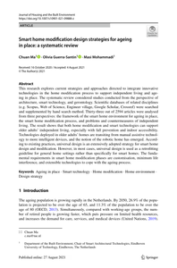 This research explores current strategies and approaches directed to integrate innovative technologies in the home modification process to support independent living and ageing in place. The systematic review considered studies conducted from the perspective of architecture, smart technology, and gerontology. Scientific databases of related disciplines (e.g. Scopus, Web of Science, Engineer village, Google Scholar, Crossref) were searched and supplemented by hand search method. Thirty-three out of 2594 articles were analysed from three perspectives: the framework of the smart home environment for ageing in place, the smart home modification process, and problems and countermeasures of independent living. The result shows that both home modification and smart technologies can support older adults’ independent living, especially with fall prevention and indoor accessibility. Technologies deployed in older adults’ homes are transiting from manual assistive technology to more intelligent devices, and the notion of the robotic home has emerged. According to existing practices, universal design is an extensively adopted strategy for smart home design and modification. However, in most cases, universal design is used as a retrofitting guideline for general home settings rather than specifically for smart homes. The fundamental requirements in smart home modification phases are customisation, minimum life interference, and extensible technologies to cope with the ageing process.