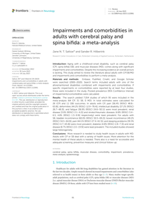 Introduction: Aging with a childhood-onset disability, such as cerebral palsy (CP), spina bifida (SB), and muscular diseases (MD), comes along with significant impairments and comorbidities. Despite the increasing evidence an overall picture is lacking. This study aimed to review the literature about adults with CP/SB/MD and impairments and comorbidities to perform a meta-analysis. Materials and methods: Embase, PubMed, Cinahl, and Google Scholar were searched (2000–2020). Search terms included adults with one of the aforementioned disabilities combined with impairments and comorbidities. If specific impairments or comorbidities were reported by at least four studies, these were included in the study. Pooled prevalence (95% Confidence Interval) of impairments/comorbidities were calculated. Results: The search yielded 7,054 studies of which 95 were included in the meta-analysis (64 CP, 31 SB, 0 MD). In total estimates were calculated for 26 (CP) and 11 (SB) outcomes. In adults with CP, pain [56.4% (95%CI 48.8–63.8)], deformities [44.2% (95%CI 12.9–78.4)], intellectual disability [37.2% (95%CI 26.7–48.3)], and fatigue [36.9% (95%CI 24.6–50.1)] were most prevalent; renal disease [3.0% (95%CI 2.1–4.2)] and stroke/rheumatic diseases {4.8% (95%CI 3.4–6.5; 4.8% (95%CI 1.5–9.9)] respectively} were least prevalent. For adults with SB, bladder incontinence [60.0% (95%CI 50.5–69.2)], bowel incontinence [49.2% (95%CI 34.5–64.0)], pain [44.1% (95%CI 27.4–61.5)], and sleeping problems [30.3% (95%CI 4.7–65.8)] were most prevalent; diabetes [4.8% (95%CI 2.8–7.3)] and renal disease [8.7% (95%CI 2.0–19.9)] were least prevalent. The included studies showed large heterogeneity. Conclusions: More research is needed to study health issues in adults with MD. Adults with CP or SB deal with a variety of health issues. More attention for the mental health of these adults is needed. There also is a need for accessible and adequate screening, preventive measures and clinical follow-up.