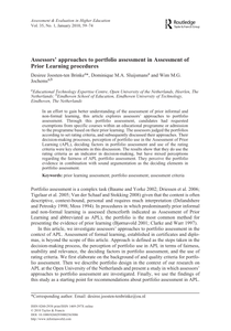 In an effort to gain better understanding of the assessment of prior informal and non-formal learning, this article explores assessors’ approaches to portfolio assessment. Through this portfolio assessment, candidates had requested exemptions from specific courses within an educational programme or admission to the programme based on their prior learning. The assessors judged the portfolios according to set rating criteria, and subsequently discussed their approaches. Their decision-making processes, perception of portfolio use in the Assessment of Prior Learning (APL), deciding factors in portfolio assessment and use of the rating criteria were key elements in this discussion. The results show that they do use the rating criteria as an indicator in decision-making, but have mixed perceptions regarding the fairness of APL portfolio assessment. They perceive the portfolio evidence in combination with sound argumentation as the deciding elements in portfolio assessment.