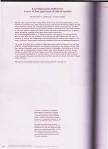 We, Rajni and Laura, have been writing letters to each other for several years including in the context of collaboration on a large research project concerned with interspecies relations and the notion of "radical equality". For Listening across difference: letters of love/questions of radical equality we arranged a series of writing sessions where we wrote letters to each other in relation to the words 'radical', 'equality' and 'radical equality'. We wrote at the same time, but different places. We did not exchange or read each other's letters until the end. The letter-writing has enabled us to reflect on aspects of our evolving (work/life) processes which in many ways feel like the core of the "work" we have one together, but that often go unnoticed by listeners and readers within the more presentational aspects of the projects. In particular, the ways in which power structures are negotiated with care and awareness between us. The choice of the form of an exchange of letters was partly inspired by Royona Mitra and Broderick D.V. Chow's The UCLA Letters: On Dismantling Whiteness in the Academy (2019). Like them, we are interested in how the process of letter writing enables a kind of dance of thinking between the conceptual and the personal. But we listen across difference differently. As two scholars of colour, Mitra and Chow's letters present their shared and diverging perspectives on how to address the Whiteness of the UK academy. As a non-binary artist of colour and as a white cis-woman researcher, our letters try to feel their way into an intimate and honest dialogue across difference.
