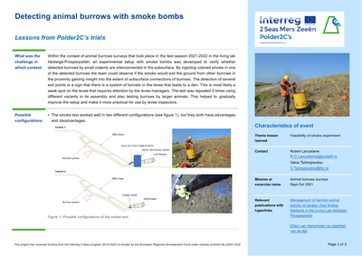 Infosheet. Within the context of animal burrows surveys that took place in the test season 2021-2022 in the living lab Hedwige-Prosperpolder, an experimental setup with smoke bombs was developed to verify whether detected burrows by small rodents are interconnected in the subsurface. By injecting colored smoke in one of the detected burrows the team could observe if the smoke would exit the ground from other burrows in the proximity gaining insight into the extent of subsurface connections of burrows. The detection of several exit points is a sign that there is a system of tunnels in the levee that leads to a den. This is most likely a weak spot on the levee that requires attention by the levee managers. The test was repeated 5 times using different variants in its assembly and also testing burrows by larger animals. This helped to gradually improve the setup and make it more practical for use by levee inspectors.