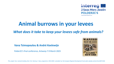 Engineers design levees without taking into account animal activity. But in reality: *Levees attract burrowing animals *Many of them are protected (e.g. beavers) *It is not always easy to detect burrows and remove them Topics of interest are: 1. Eco engineering approaches for deterrence of animals How can we make animals go elsewhere? 2. Detection and measurement techniques How can we find burrows on a levee and measure their geometry? 3. Failure paths How do levees fail when they have burrows? 4. Effectiveness of countermeasures How can we repair levee damages made by burrowing animal?s