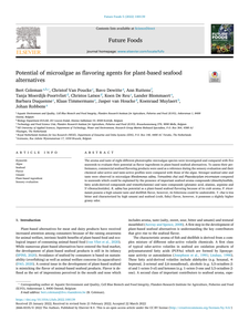 The aroma and taste of eight different phototrophic microalgae species were investigated and compared with five seaweeds to evaluate their potential as flavor ingredients in plant-based seafood alternatives. To assess their per- formance, commercial seafood flavoring products were used as a reference during the sensory evaluation and their chemical odor-active and taste-active profiles were compared with those of the algae. Stronger seafood odor and taste were observed in microalgae Rhodomonas salina, Tetraselmis chui and Phaeodactylum tricornutum compared to seaweeds which could be explained by the presence of important seafood aroma compounds (dimethylsulfide, fatty acids-derived compounds and trimethylamine) and taste compounds (glutamic acid, alanine, arginine and 5 ′ -ribonucleotides). R. salina has potential as a plant-based seafood flavoring because of its crab aroma. P. tricor- nutum possess a high umami taste and shellfish flavor, however, its bitterness could be undesirable. T. chui is less bitter and characterized by high umami and seafood (crab, fishy) flavor, however, it possesses a slightly higher grassy odor.