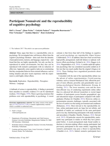Many argue that there is a reproducibility crisis in psychology. We investigated nine well-known effects from the cognitive psychology literature—three each from the domains of perception/action,memory, and language, respectively—and found that they are highly reproducible. Not only can they be reproduced in online environments, but they also can be reproduced with nonnaïve participants with no reduction of effect size. Apparently, some cognitive tasks are so constraining that they encapsulate behavior from external influences, such as testing situation and prior recent experience with the experiment to yield highly robust effects.