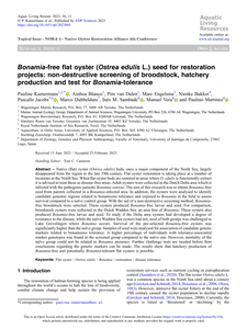 Native (flat) oyster (Ostrea edulis) beds, once a major component of the North Sea, largely disappeared from the region in the late 19th century. Flat oyster restoration is taking place at a number of locations in the North Sea. When flat oyster beds are restored in areas where O. edulis is functionally extinct it is advised to treat these as disease-free areas. Adult oysters were collected in the Dutch Delta area which is infected with the pathogenic parasite Bonamia ostreae. The aim of this research was to obtain Bonamia-free seed from parents collected in a Bonamia-infected area. In addition, the oysters were analysed to identify candidate genomic regions related to bonamiosis tolerance and exposed to Bonamia in the field to assess survival compared to a naïve control group. With the aid of a non-destructive screening method, Bonamia-free broodstock were selected. These oysters produced Bonamia-free larvae and seed. For comparison, broodstock oysters were collected in the Dutch Wadden Sea, an area free of Bonamia. These oysters also produced Bonamia-free larvae and seed. To study if the Delta area oysters had developed a degree of resistance to the disease, while the naïve Wadden Sea oysters had not, seed of both groups was challenged in Lake Grevelingen where Bonamia occurs. Survival of the pre-selected Bonamia-free oysters was significantly higher than the naïve group. Samples of seed were analysed for association of candidate genetic markers related to bonamiosis tolerance. A higher percentage of individuals with tolerance-associated marker genotypes was found in the screened group compared to the naïve one. However, mortality of the naïve group could not be related to Bonamia presence. Further challenge tests are needed before firm conclusions regarding the genetic markers can be made. The results show that hatchery production of Bonamia-free and potentially Bonamia-tolerant flat oysters is possible.